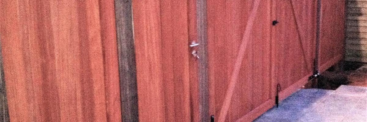 Een mooi voorbeeld van een poort en enkele tuindeuren in padouk. Merk vooral de natuurlijke verkleuring (en bescherming) op van de padouk in een tijdsspanne van 1 maand.